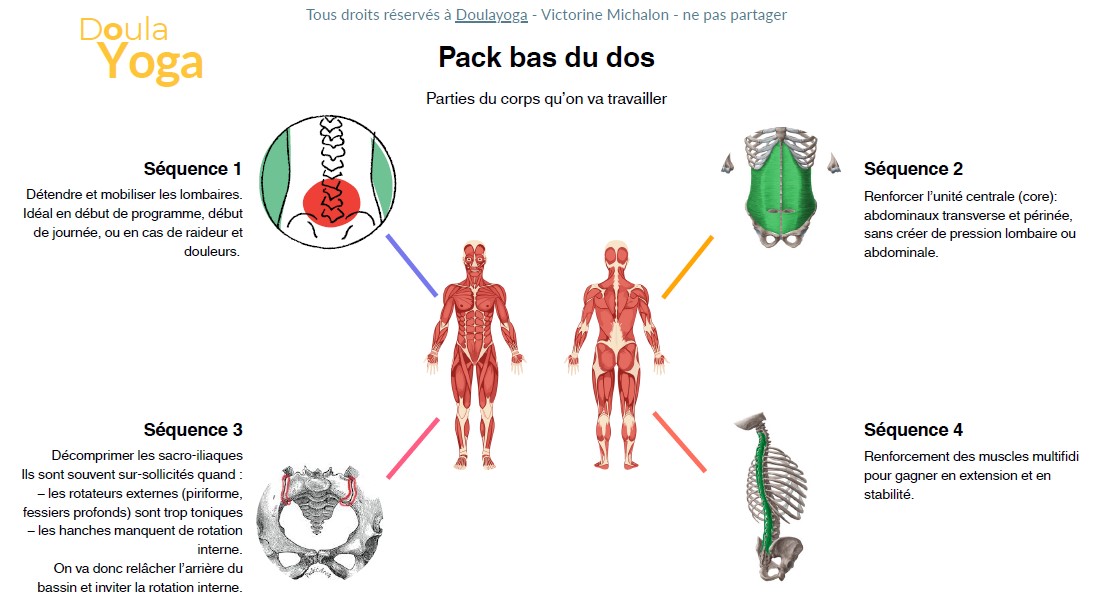 Mon pack bas du dos t’en propose une vingtaine au total, agencées intentionnellement en 4 séquences de 15 minutes s’attaquant progressivement et en douceur aux causes les plus communes de douleur : détendre et mobiliser toute la zone lombo-sacrée, renforcer l’unité centrale (core : abdos et périnée), décomprimer les sacro-iliaques en respectant leur besoin de stabilité, et renforcer les muscles le long de la colonne.